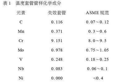 保護套管的材質為SA213-T91,失效試樣的化學成分與美國工程師學會制定的鍋爐及壓力容器規范第I卷A篇《鐵基材料》(以下簡稱ASME規范)對比如表1所示。其化學成分基本符合ASME規范要求。