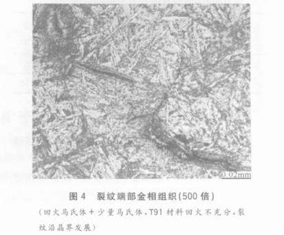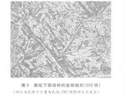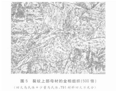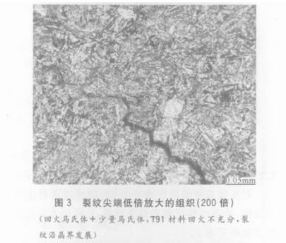 4.2金相組織顯示,裂紋沿晶界擴展,試樣中殘留少量馬氏體,說明套管材料在熱處理過程中回火不.充分。