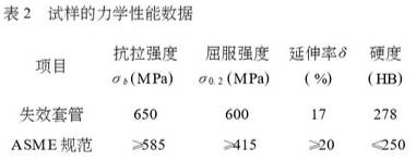 對失效套管切取了部分材料,制成試樣后進行了拉伸、沖擊性能試驗和硬度測量,試樣的力學性能測試數據見表2。
